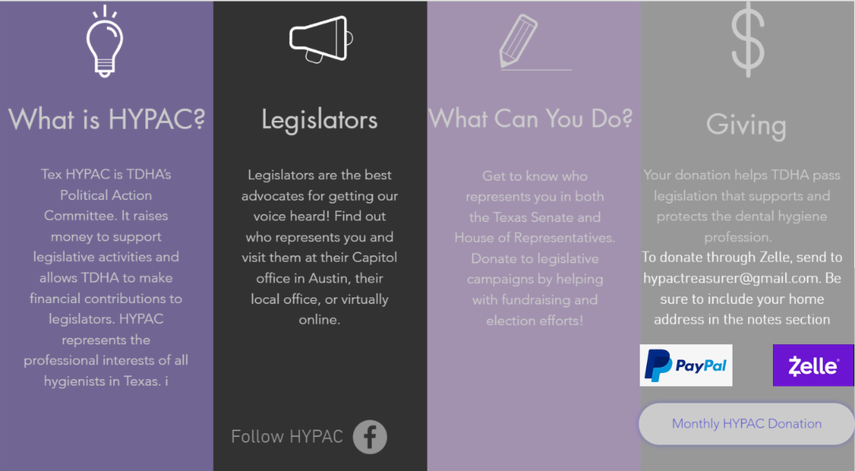 HyPAC: is the Political Action Committee. They are the organization that raises money privately to voice the concerns of hygienist during times of legislation.