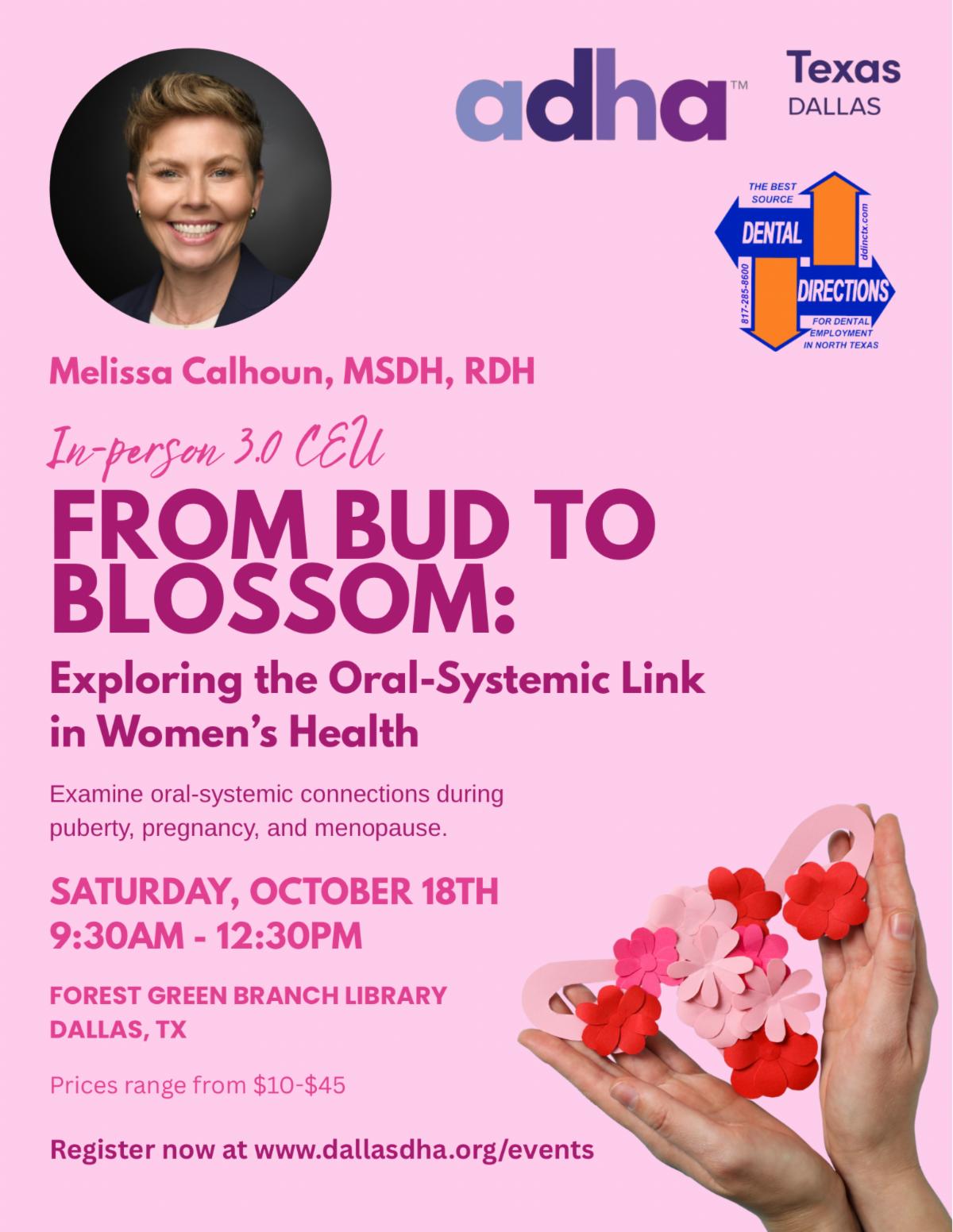 Oct 18th: 3-hour In-Person CE - From Bud to Blossom: Exploring the Oral-Systemic Link in Women's Health with Melissa Calhoun, MSDH, RDH - Forest Green Branch Library, Dallas, TX
