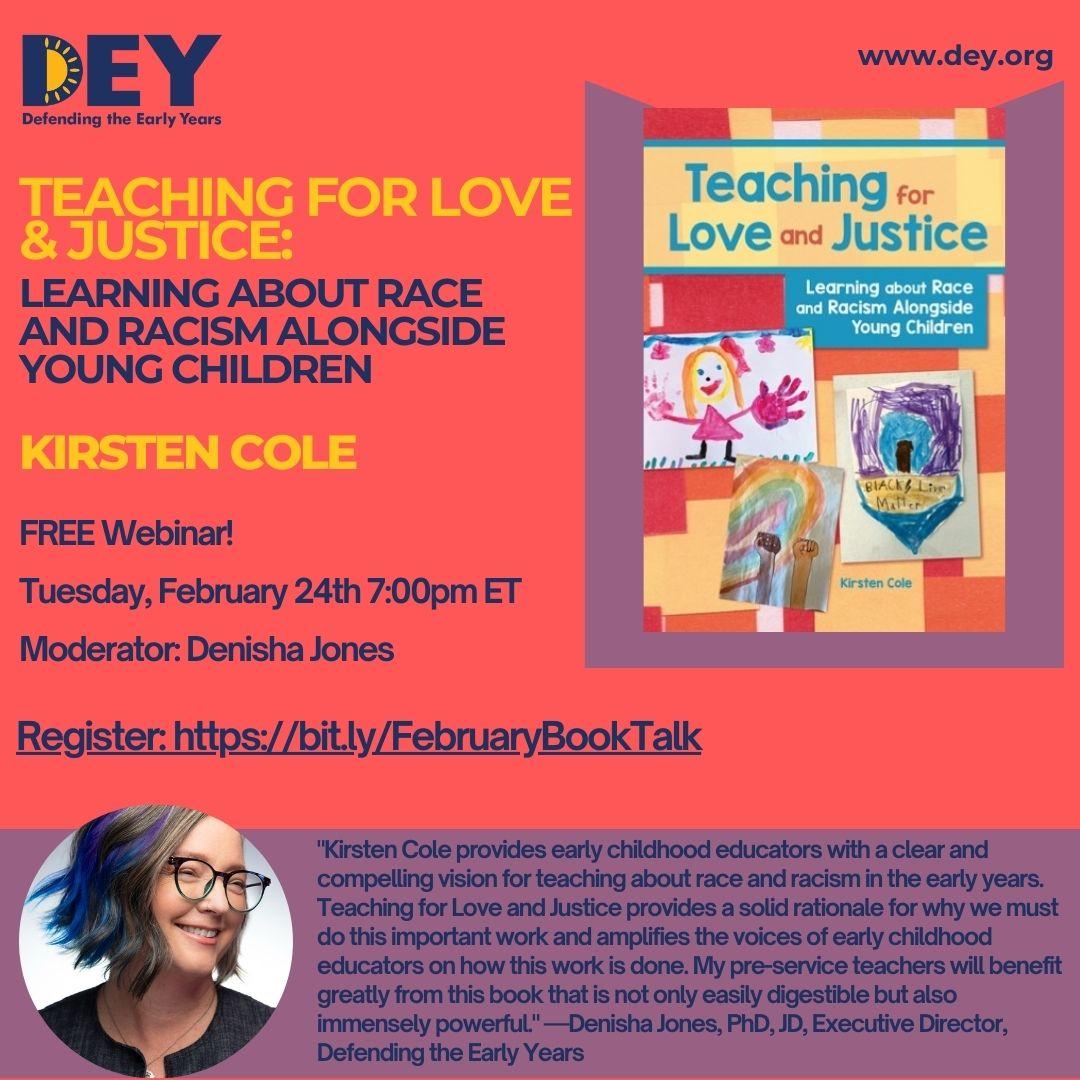 | | | Our next Research into Practice Book Talk is on February 24th at 7 pm EST. Join DEY ED Denisha Jones and early childhood professor and author Kirsten Cole for a discussion on her newly published book, Teaching for Love and Justice: Learning About Race and Racism Alongside Young Children. Click on the link below to register! | |