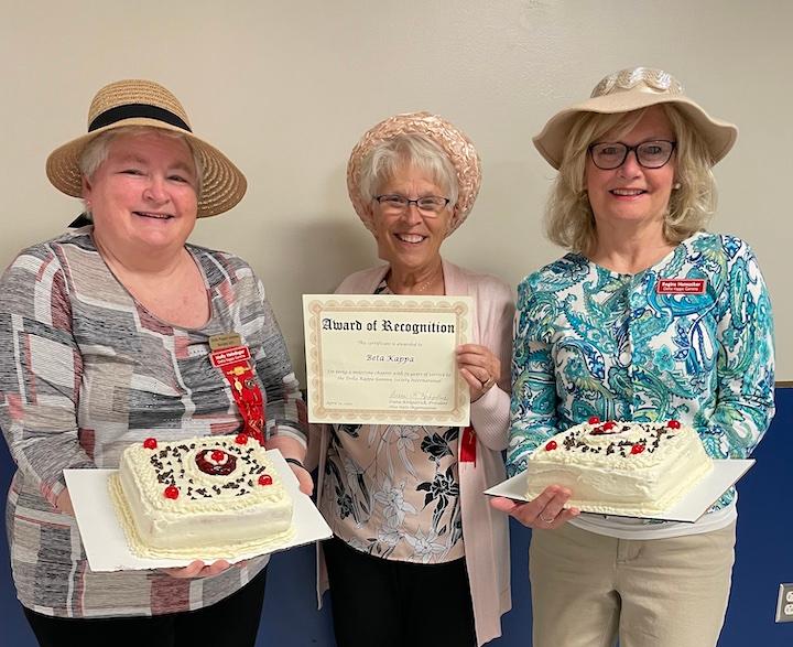 Beta Kappa Chapter celebrated its 75th birthday by wearing hats reminiscent of the 40's. Chapter members celebrated with two birthday cakes and recognized members celebrating their milestone years with certificates. Coleen Lumpkin was recognized for 50 years as a member.