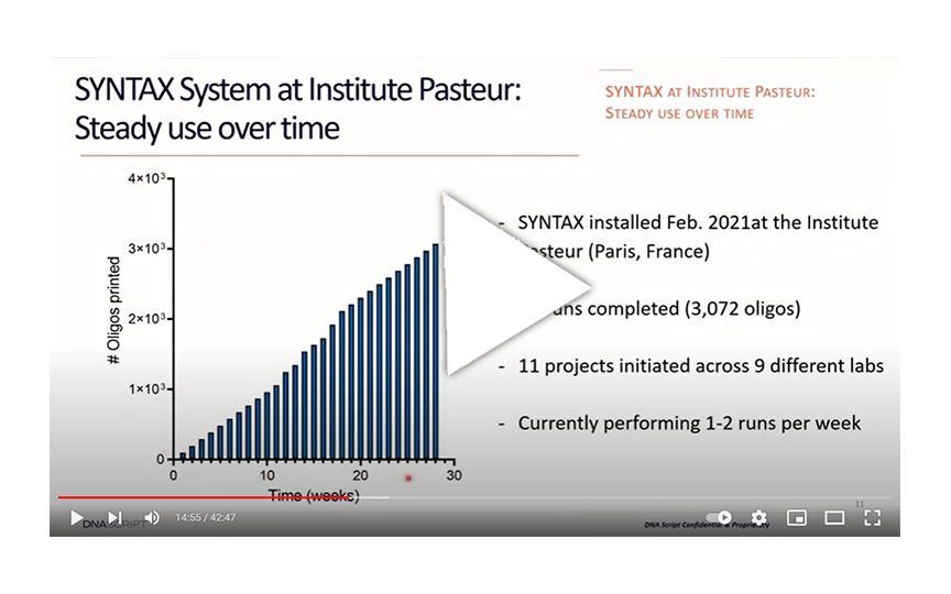 Happy holidays to you, your colleagues, and families! It's been an exciting year for us at DNA Script, full of collaborations aimed at responding to and mitigating future pandemic threats, a targeted commercial release of the SYNTAX System and 60-cycle kit, and scaling up to prepare for our full product launch early next year.