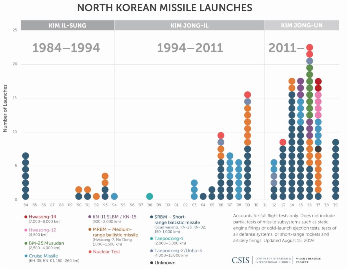 North Korea continues an extensive series of SRBM (short-range ballistic missile) tests. SRBMs have a range of roughly 1,000 kilometers or 620 miles. Since this chart was produced by the Center for Strategic and International Studies on August 15th, Pyongyang has conducted six additional SRBM tests. The 2019 SRBM tests are one shy of the previous high set in 2014 for that class of missile.