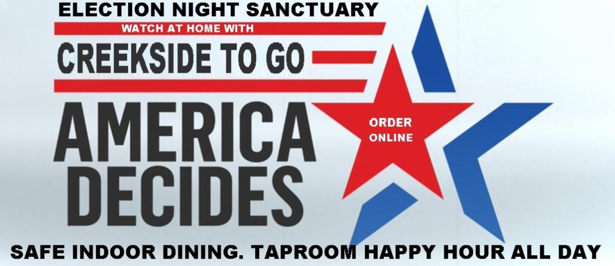 SAFE HAVEN: Election Day Happy Hour All Day | November 5th: Rock Your Vote, then Order Creekside To Go and watch at home, or come to Creekside for our ALL DAY taproom happy hour (2 drink max pp, 12 Noon to 9PM) where we will not be broadcasting any election programming or news. Creekside will be that safe haven, a media blackout, an escape from the chaos, a sea of tranquility ...dosed with Happy Hour pricing on beer and wine all day. | | |