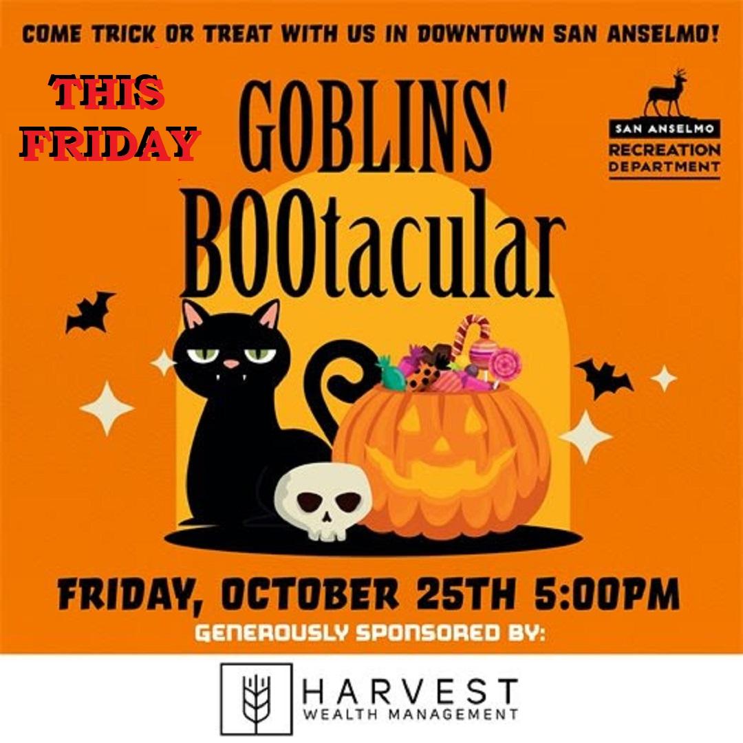 FRIDAY FUN NIGHT: Downtown Halloween Party | THIS FIRDAY, the freaks come out at night for San Anselmo's most attended free public annual event, the Goblins' BOOtacular; a trick-or-treat street event for all... focusing on our youth costumed trick-or-treaters and family-focused fun. San Anselmo Avenue gets closed to vehicles at 4PM, and the goblins are in full swing by ...CLICK TO READ MORE | | |
