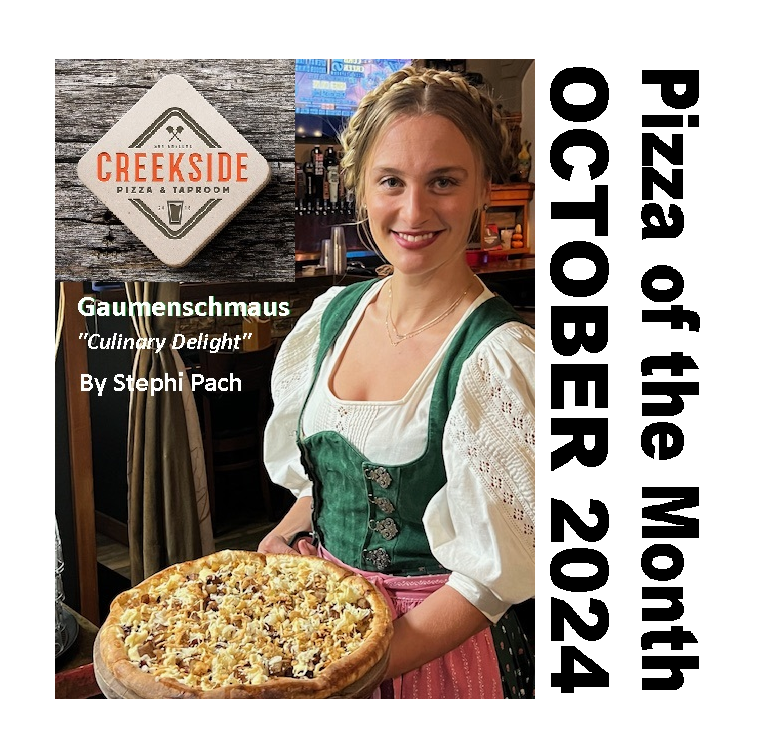 PIZZA of the MONTH: Gaumenschmaus | Creekside's official German resident, Stephi Pach, presents Gaumenschmaus. ONLYONE WEEK LEFT for this amazing German bratwurst Oktoberfest Pizza: Creamy ricotta base sauce, light mozzarella cheese, topped with traditional German bratwurst, Applewood smoked bacon, balsamic onions, roasted potatoes, finished with sauerkraut, homemade ...CLICK TO READ MORE | | |