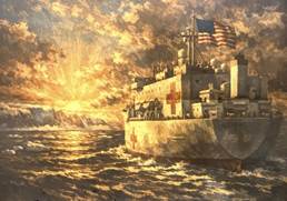 At least he was able to find a digital rendering of a painting of one of our hospital ships, the USNS Mercy, sailing into the sunset to attach to his post, but the Mercy cannot possibly be “on the way” for at least three more days since its crew is on liberty in its home port city of San Diego.