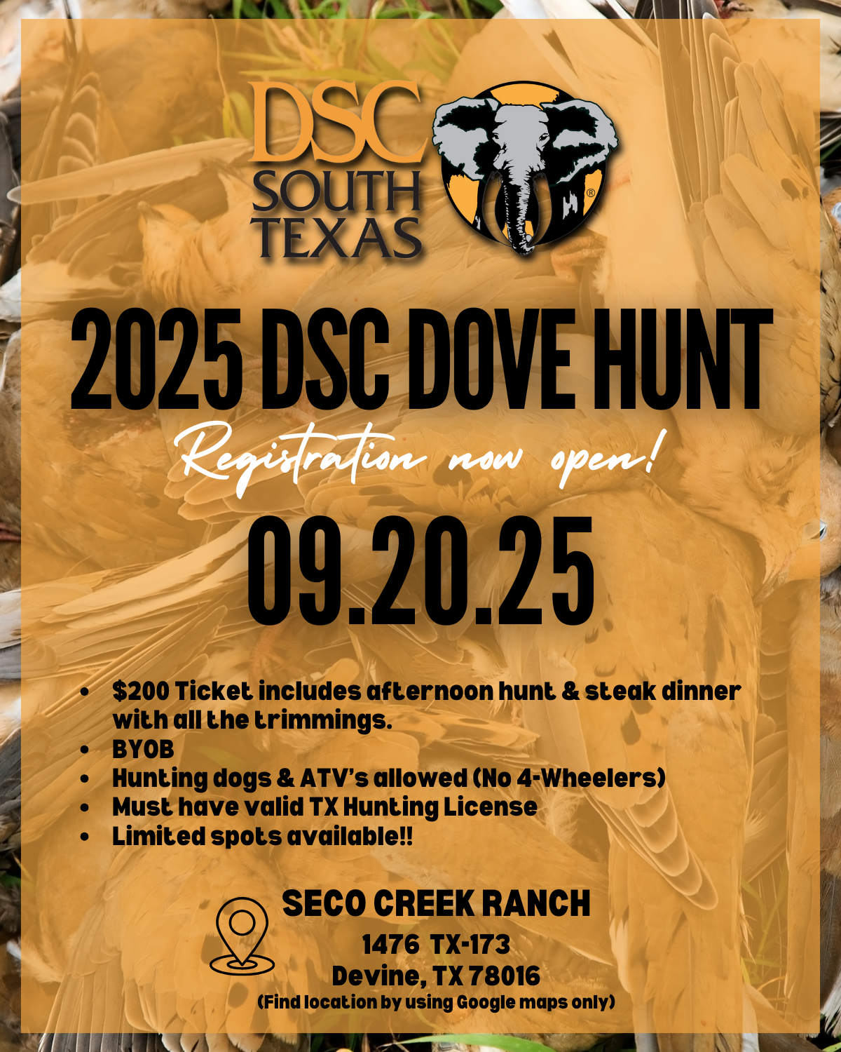 2025 DSC South TX Dove Hunt: September 20th, 2025 at Seco Creek Ranch in Devine, TX