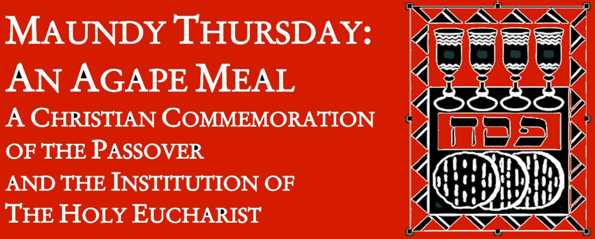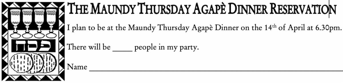 The Maundy Thursday Agapè Meal and Liturgy will be celebra-ted a little differently than previously advertized.