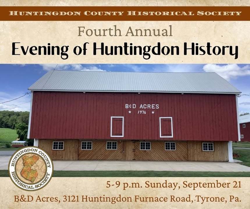 Join the Huntingdon County Historical Society for the 4th Annual Evening of Huntingdon History on Sunday, Sept. 21, from 5-9 p.m. at B&D Acres in Tyrone, Pa.