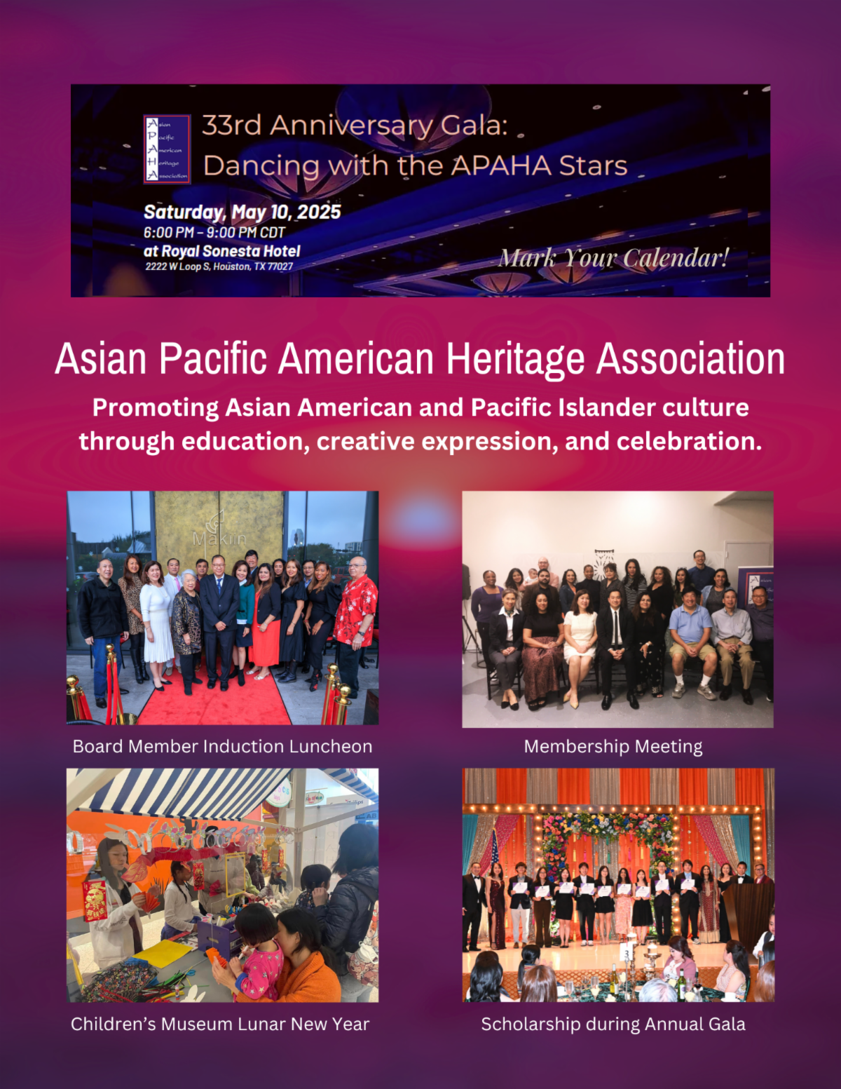 Join us for the evening of annual gala highlighting Houston's Asian/Pacific Heritage Month of May. Distinguished citizens are honored, riveting entertainment is presented, and a delicious ethnic meal is shared. It is a key opportunity for the members of the Asian/Pacific American community to come together and celebrate their culture.