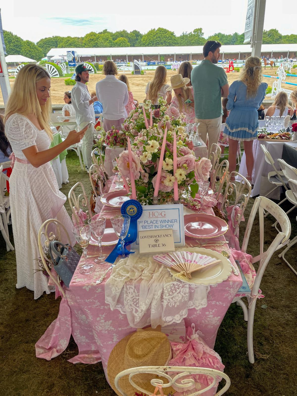 A different competition, the Hampton Cottages & Gardens Table Décor Awards, took place in the VIP Tent during Sunday’s final class. LoveShackFancy, Rebecca Hessel Cohen’s lifestyle and travel-inspired clothing brand, took blue-ribbon honors for having the best-decorated table.
