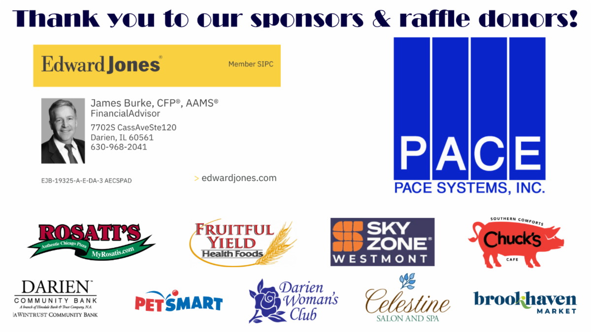 I want to give thanks to our corporate sponsors, James Burke of Edward Jones, and Chris Sweeney of Pace Systems, as well as to our local businesses who donated prizes for our gift raffle. Special thanks go to our Darien Business Alliance, whose leadership and development of the event was crucial to the success of the evening. In particular, I extend heartfelt thanks to April Padalik, Executive Director of the DBA and Jessica Plzak, whose tireless efforts and countless contributions made this event possible.