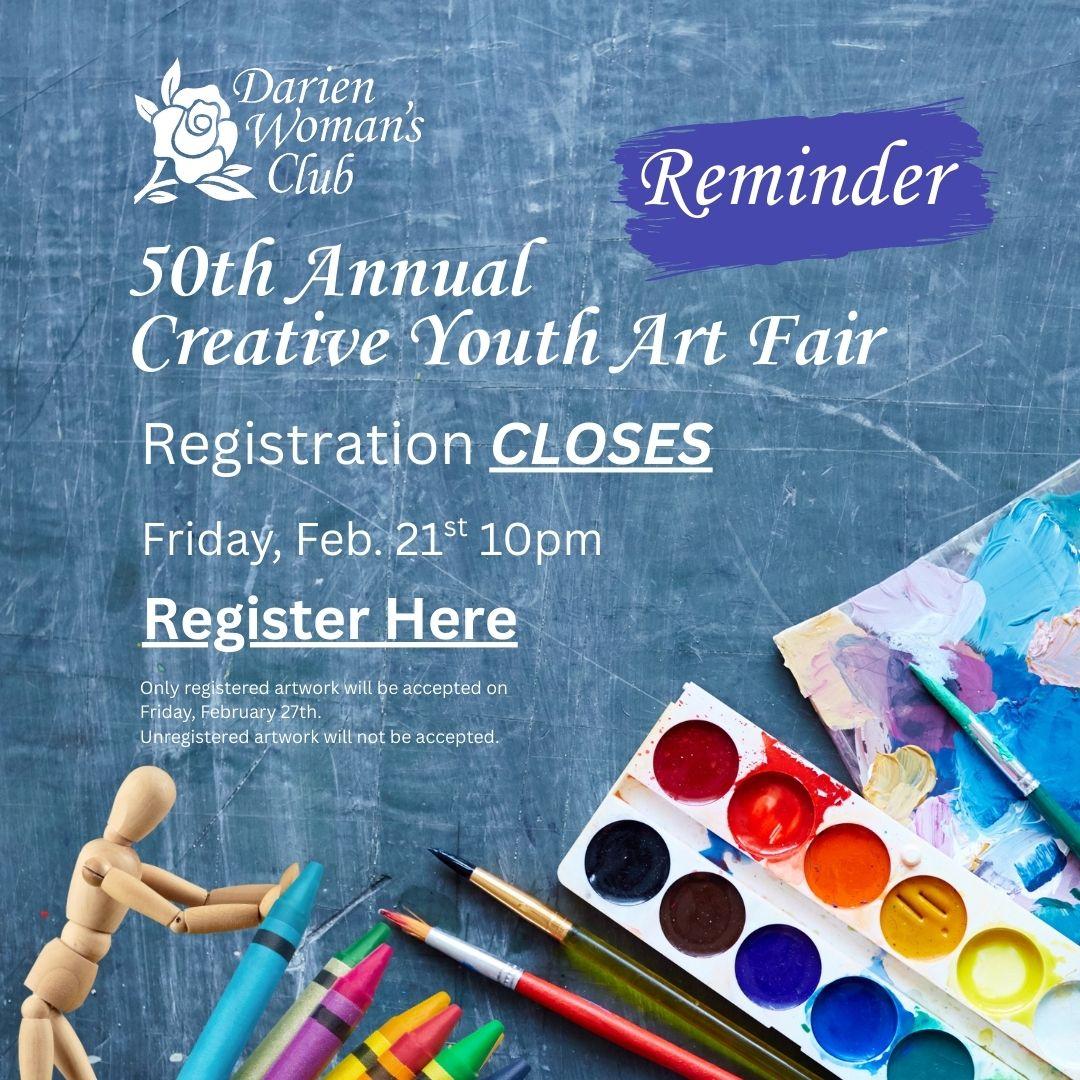 The Darien Woman's Club is hosting its 50th Creative Youth Art Fair on Sunday, March 1 at Cass Junior High School from 2:00-3:30 p.m. in the gym. Local community students are invited to submit up to (2) two pieces of art to be judged at the Art Fair. Prizes will be awarded.