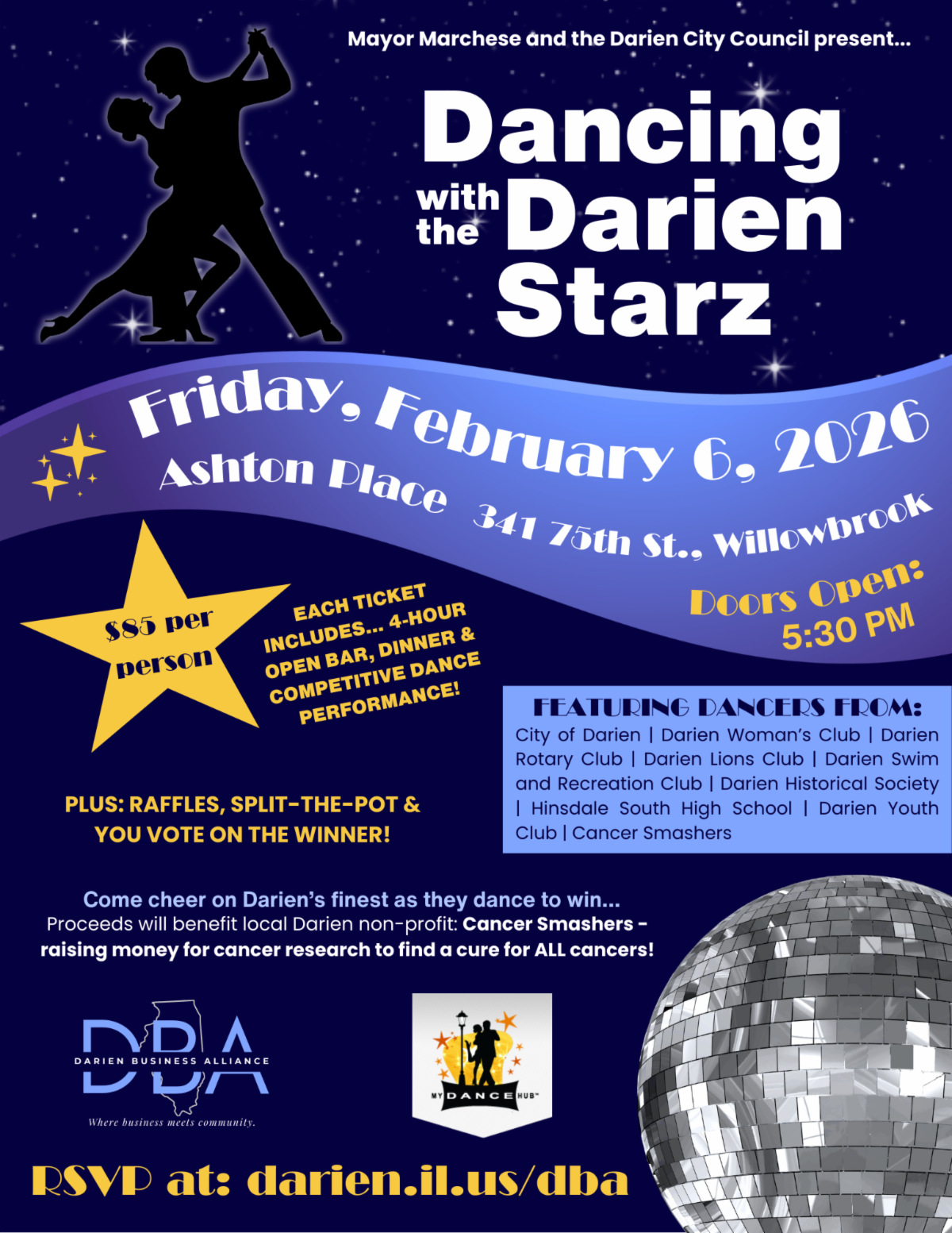 Just like the TV Show, Darien is bringing you Dancing with the Darien Starz featuring Darien area dancers from local NFP groups supporting Cancer Research. Ticket includes: (4) hour open bar, family style dinner, raffles, split the pot, and a professional dance competition! Get your tickets NOW at: darien.il.us/business then click on the flyer...