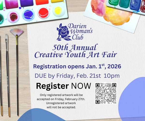 The Darien Woman's Club is hosting its 50th Creative Youth Art Fair on Sunday March 1, 2026 at Cass Junior High School from 2:00-3:30 p.m. in the gym. Local community students are invited to submit up to (2) two pieces of art to be judged at the Art Fair. Prizes will be awarded.