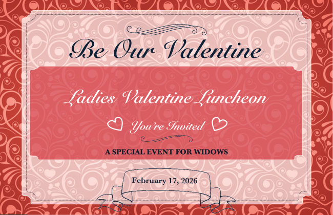 Reserve your spot at the Ladies Valentine Luncheon on February 17 at 11:30 a.m.! This is a special event for widows hosted by the Modell Funeral Home at Maggiano's Little Italy and you can reserve your spot by email or by calling (630) 852-3595 no later than February 13. View flyer.