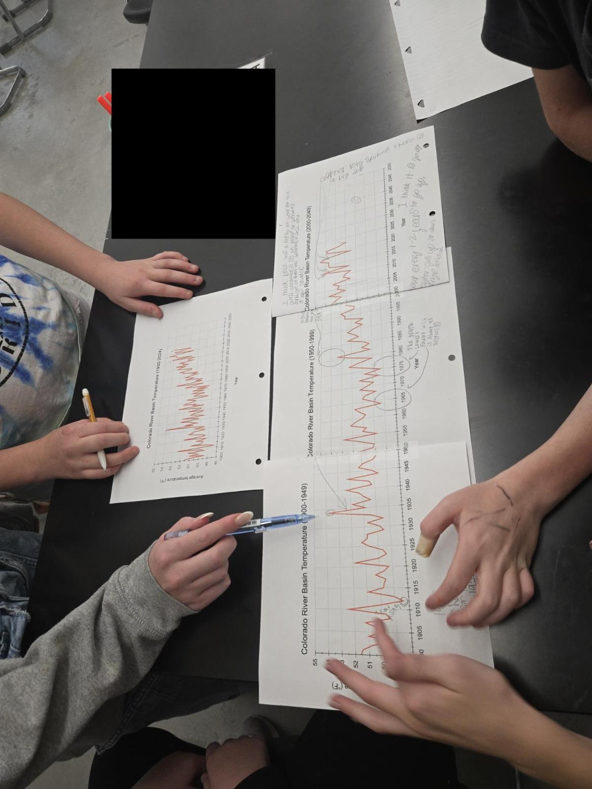 Data sensemaking in action: In Megadrought, students are investigating factors that are contributing to the megadrought in the Colorado River Basin. In order to test their predictions about what is causing the megadrought students look at regional data collected over a 150 year period. First, pairs of students begin by looking at either temperature or precipitation data in the Colorado River Basin over a 50 year period. Next, the pairs group up to look at either the full temperature or precipitation data set over the 150 years of data. Lastly, students look at temperature and precipitation together. Throughout the Zoom In, students are encouraged to ask questions, annotate their graphs, and share what they are noticing. You can find the "Zoomed in" data sets in this slide deck.