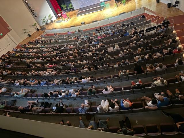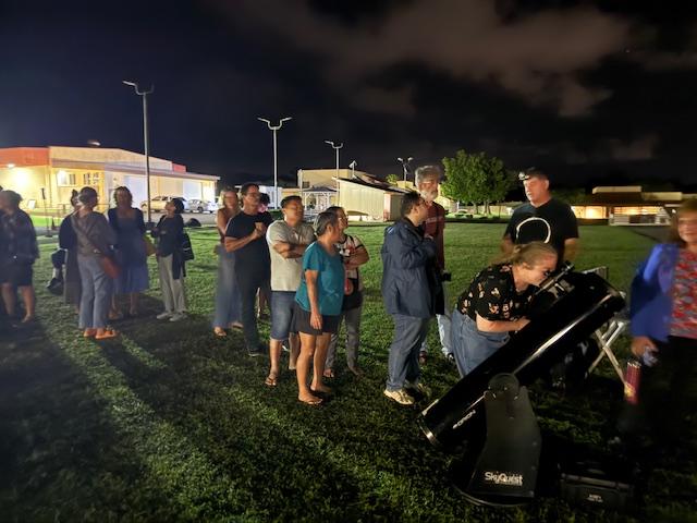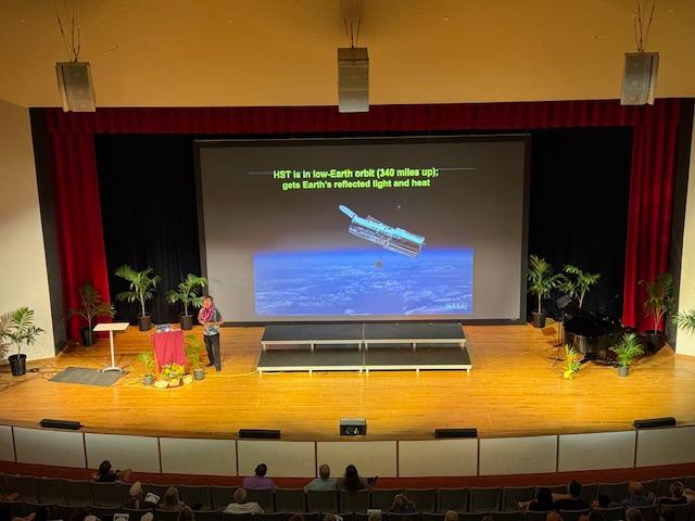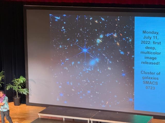 Huge Crowd for Professor Filippenko's Lecture | | | | A crowd of 330+ (I stopped counting when program began) attended the FREE lecture by Dr. Alex Filippenko, Distinguished Professor of Astronomy at UC Berkeley on Saturday evening. The event was sponsored by Kauai Education Association for Science & Astronomy and the PAC. Dr. Filippenko's topic was the James Webb Space Telescope. Following the talk, KEASA set up six telescopes on the PAC Lawn for the audience to view the planets. | | Prof Filippenko's slides on the galaxies. | | And the James Webb Space Telescope. | | Somehow the word got out... | | After the talk, crowd heads to the telescopes! | | Good thing KEASA brought 6 telescopes! Woman on right peers at the heavens. | | The skies cooperated and great views thrilled the crowd. | | Did you know...The Milky Way is 13.61 Billion Years Young...There are an estimated 100 Billion Planetary Systems in the Milky Way...there are Two Trillion observable galaxies in the universe. James Webb Space Telescope is 1 million miles from Earth or farther than Waimea to Ha`ena. | | Factoid: There are an estimated 1,743 Performing Arts Center in the U.S. employing 68,500 people...that includes KCC PAC and its one employee. | |