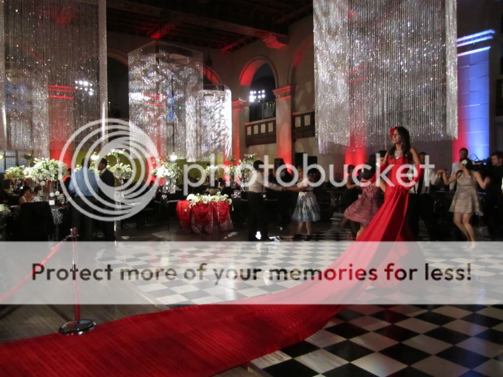 The living red carpet gave the wedding reception a whimsical yet dramatic air.