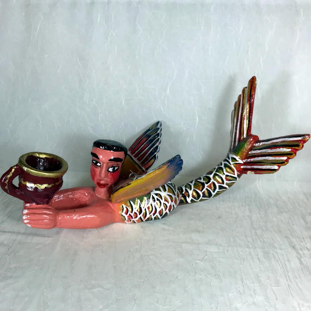 This flying mermaid represents a petition for bountiful fishing as well as safety on the open seas. The pot she is holding represents an offering. T