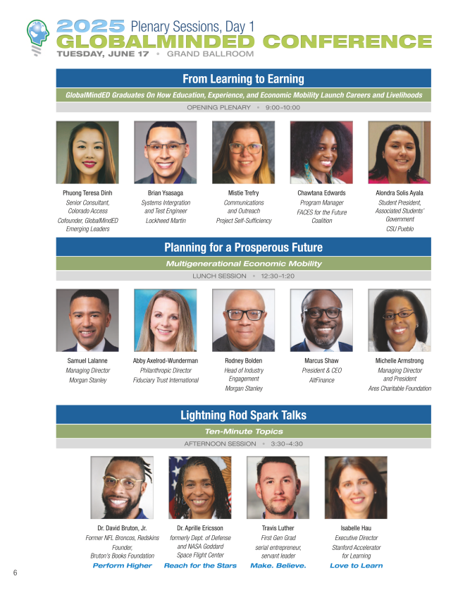 The day begins in the Grand Ballroom with an energizing opening plenary that centers the voices of GlobalMindED graduates. These emerging leaders share how education and experience have propelled them toward meaningful careers—and how institutions can better support multigenerational economic mobility.