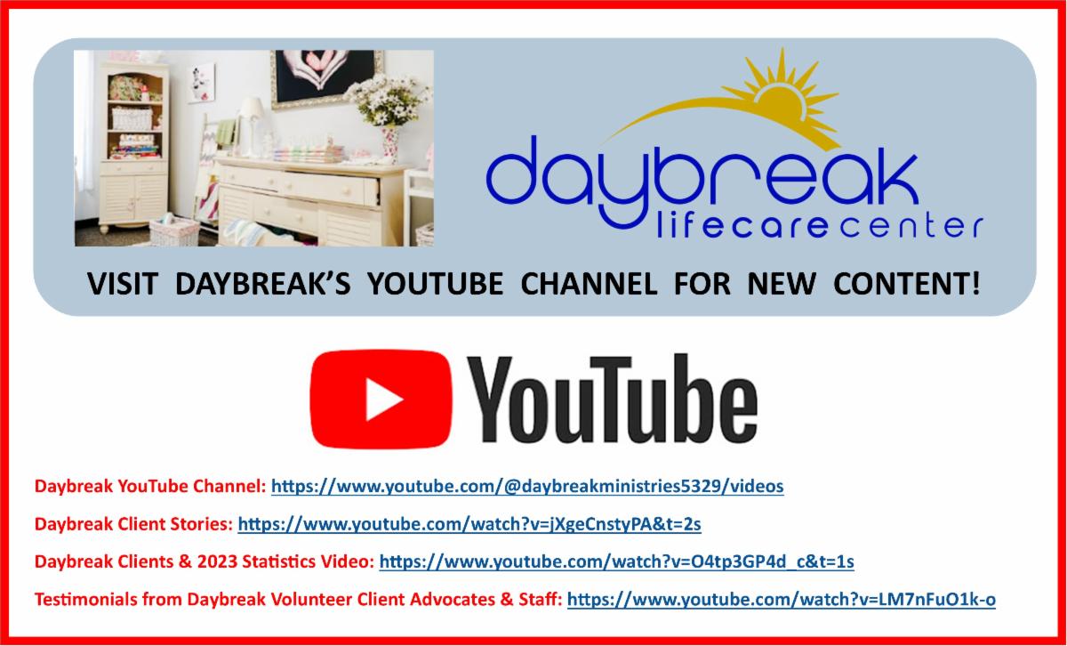 FOR THE MONTH OF MAY, we had 96 client visits, 45 of which were new Daybreak clients. We performed 48 pregnancy tests. 35 of those tests were positive, and 21 ultrasounds were performed. For the month, 42 Community Care clients were served, and we had 2 mothers graduate from our “Baby Bucks” program and qualify for shopping sessions in “Taylor’s Boutique”.