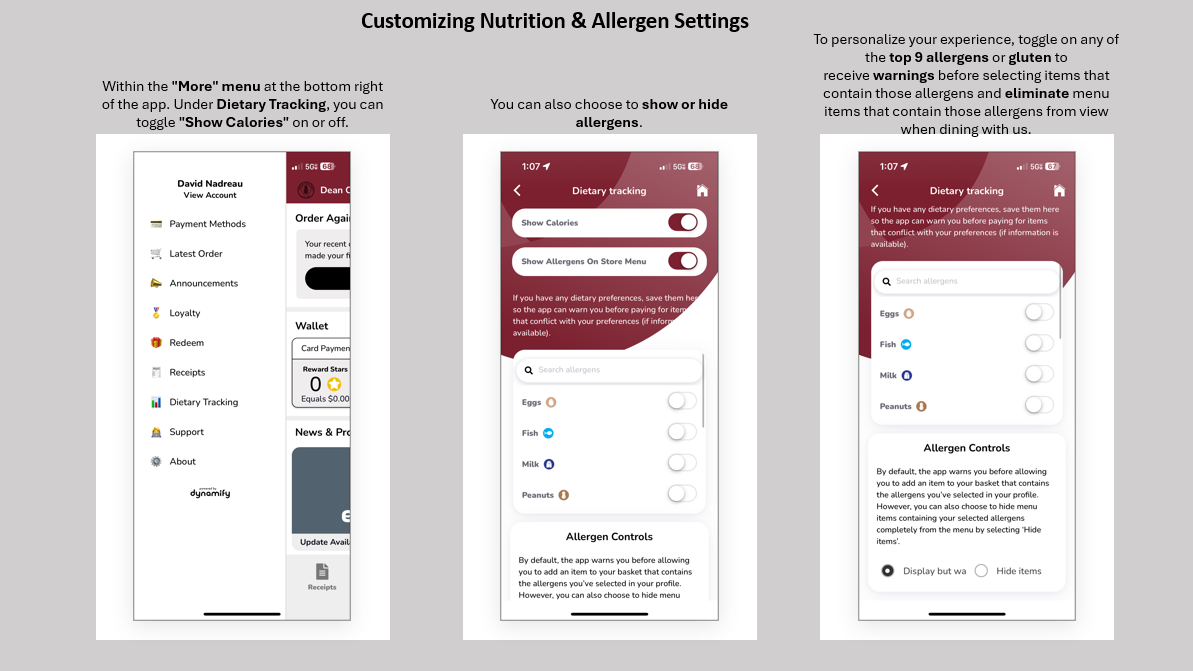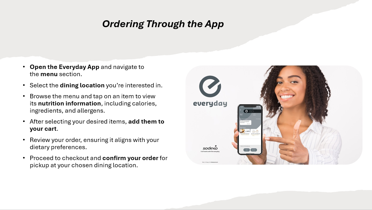 - Download the Everyday App (pictured below) to view menus, mobile ordering and express pickup at the Beanery and Boomers and identify options based on food allergens or sensitivities.