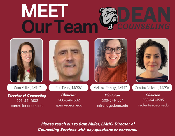 The Counseling Center staff will be holding meet and greets during the first week of the semester. Please be on the lookout for more details and information regarding these events on campus, on the Counseling Center's Instagram page, and on myDean.