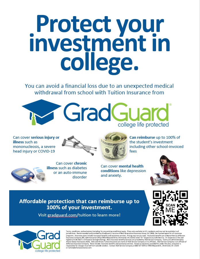 We know that the cost of a college education is a large monetary investment and that the unexpected can occur. With this in mind, the College works with GradGuard to offer both tuition and renter's insurance. These are voluntary options for coverage. Please refer to gradguard.com/tuition and gradguard.com/renters for more information on cost and coverage options. In previous years, a few hundred dollars provided coverage for up to $20,000 dollars of tuition coverage.
