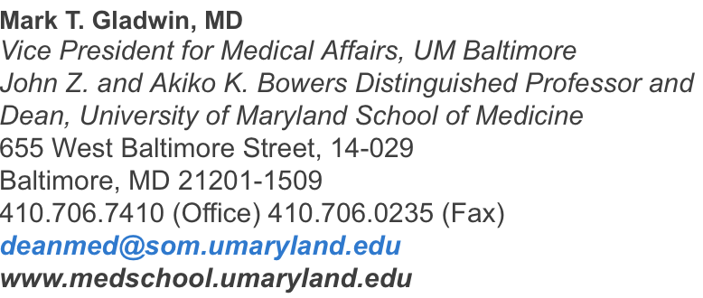 Since my arrival at the University of Maryland School of Medicine I have so much appreciated your showcasing your departments, centers, institutes, and programs to me and Dr. Chris O’Donnell through our “mini retreats.” I’ve met with and toured over 30 academic units in just three months. I’ve been overwhelmingly impressed by your excellence, by our facilities, and by the resources we have available here at the School of Medicine. I’ve also been attending your research, education, and anniversary celebrations, and I can only begin to express what a thrill it is to be in the mix, participating in your achievements and brainstorming on what’s next for us as an institution.