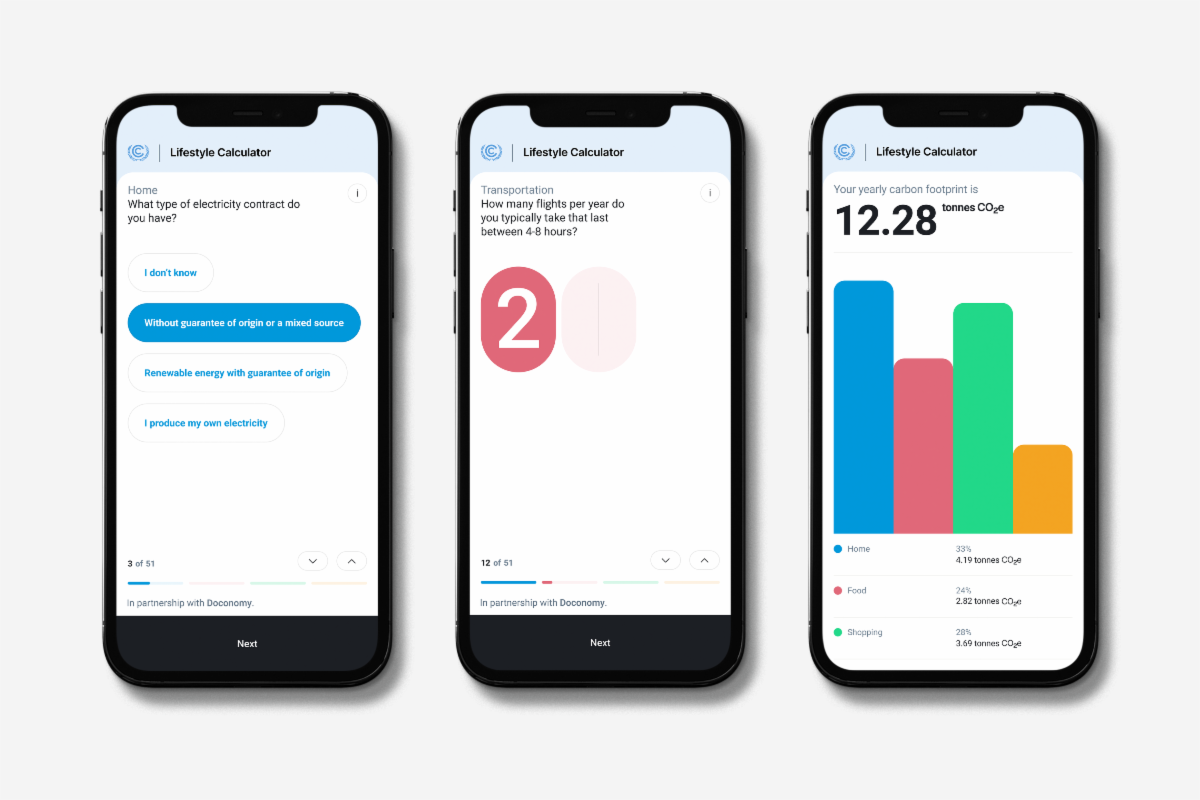 The calculator was built in partnership with Swedish fintech Doconomy. It is an open-source tool, that can be used by anyone, and further improved in the long-run. It features new elements to allow for a more precise measurement of emissions, both for individuals or organizations. For instance, new categories of emission sources such as shopping habits are now part of the calculation. It is also region specific, with data that is tailored to the user’s location and retail habits.