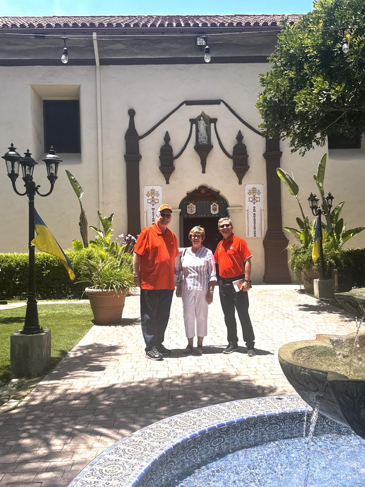 | Wayne and Pam Eichele pose with Dr. Hummel at Ventura Mission. | |