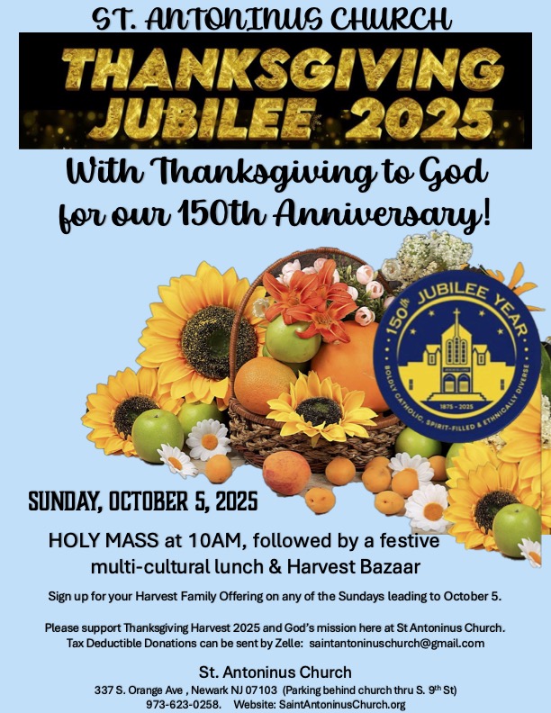 Mark your calendar for our Grand Thanksgiving Jubilee on Sunday, October 5, 2025, at St. Antoninus. The day begins with Holy Mass at 10:00 AM, followed by a Parade of Nations, a multicultural luncheon, a harvest bazaar and a lively auction