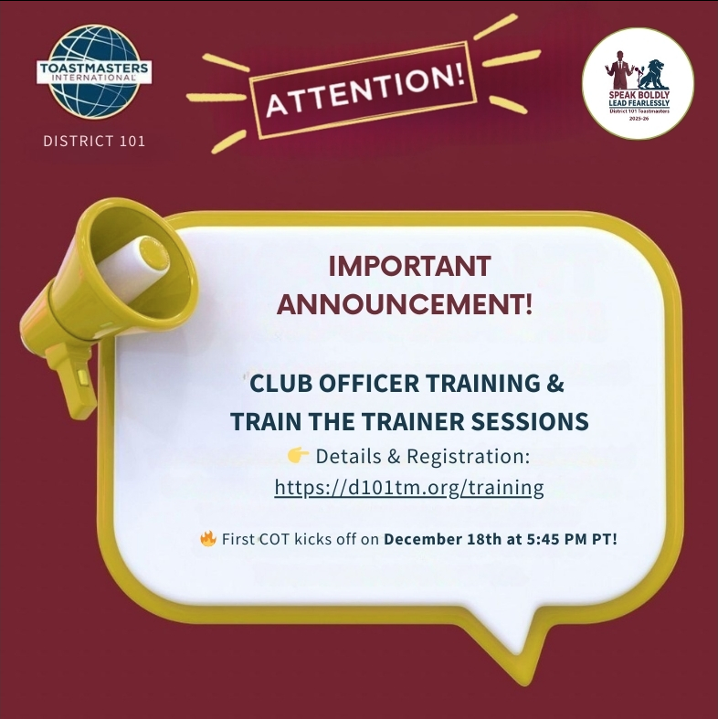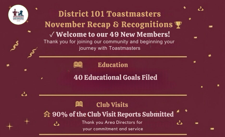 This month, I encourage you to write down the things you want to accomplish, both in the short term and the long term. Whatever your list holds, two things will always strengthen your progress: continuously becoming a better communicator and a stronger leader. Your membership in this club is a vital part of that journey. So continue to invest in your growth, especially if times are challenging.