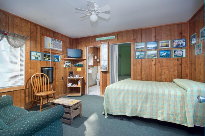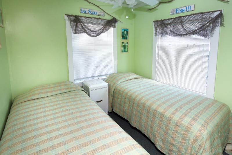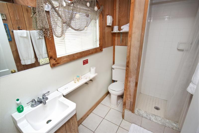 BELOW Our smallest unit is the little pink Shrimp. This tiny shack was built in 1937 and still has jalousie windows. It has a bedroom with two twin beds and a full bed in the main living area. The bathroom is tiny too (see picture below). Amenities includes a coffee maker. Sleeps 4.