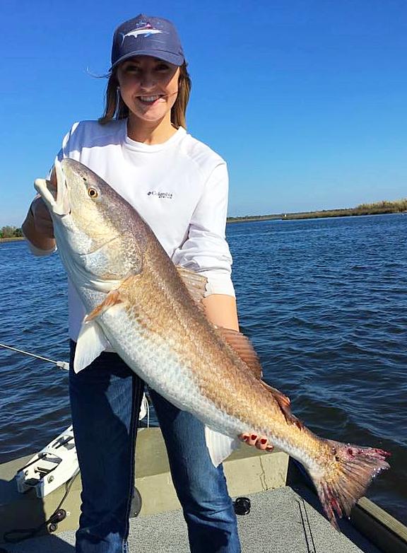 Maddy Fletcher landed a whopper of a redfish using a Mirrolure 17MR18BG lure.