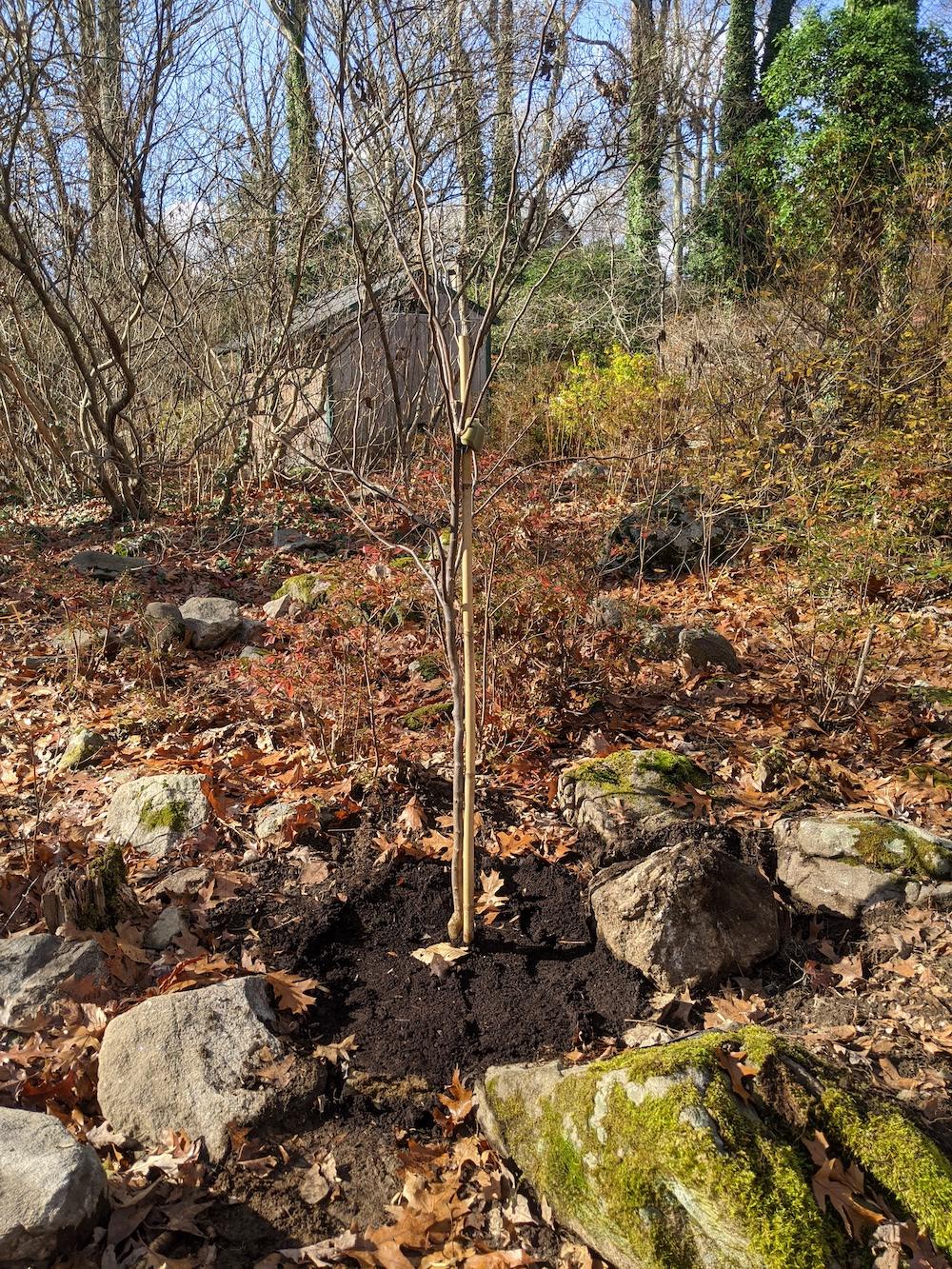 It is a Redbud 'Forest Pansy' and is located just past the tool hed near the seating area. Jenn at Copia helped us get this tree in a smaller root ball, because planting at Lee involves moving rocks! Note rocks around it.