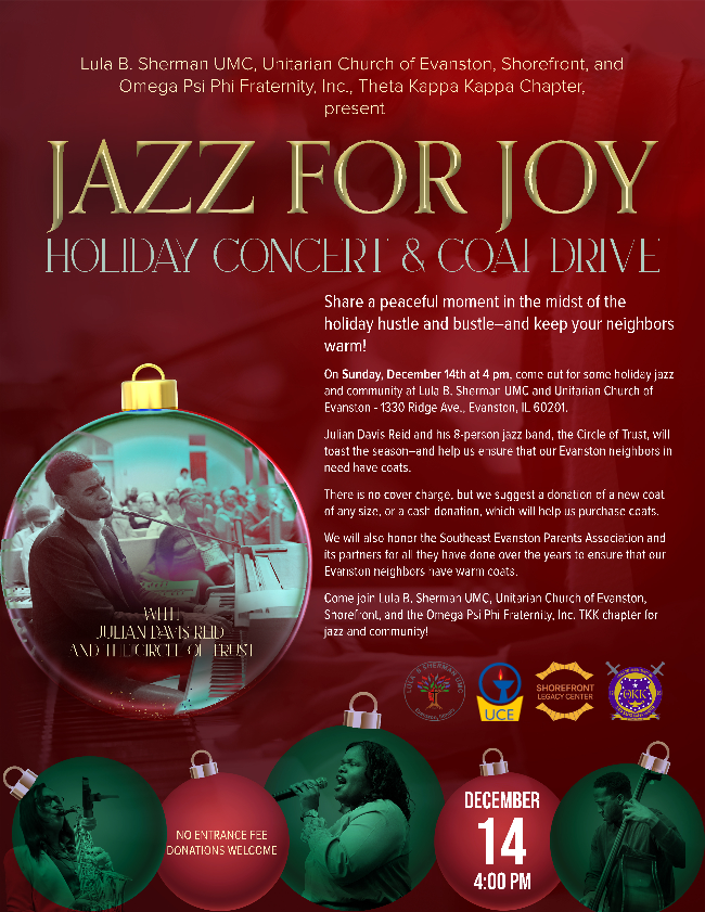 2025, at 4 pm. Along with Sherman United Methodist Church, Shorefront, and Omega Psi Phi fraternity from Northwestern University, we are hosting a holiday jazz concert.