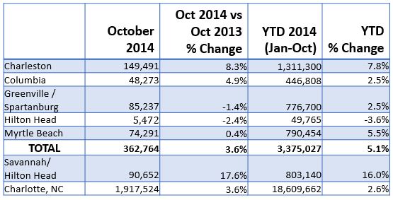 Statewide Hotel RevPAR -- An increase in statewide hotel occupancy of 4.9%, combined with a 6.3% increase in Average Daily Room Rates yielded an 11.5% increase in Hotel RevPAR statewide. RevPAR in the Orangeburg/Sumter, Walterboro/Hardeeville and North Myrtle Beach areas increased more than 20% during the month. Statewide RevPAR averages $65.61 year-to-date.