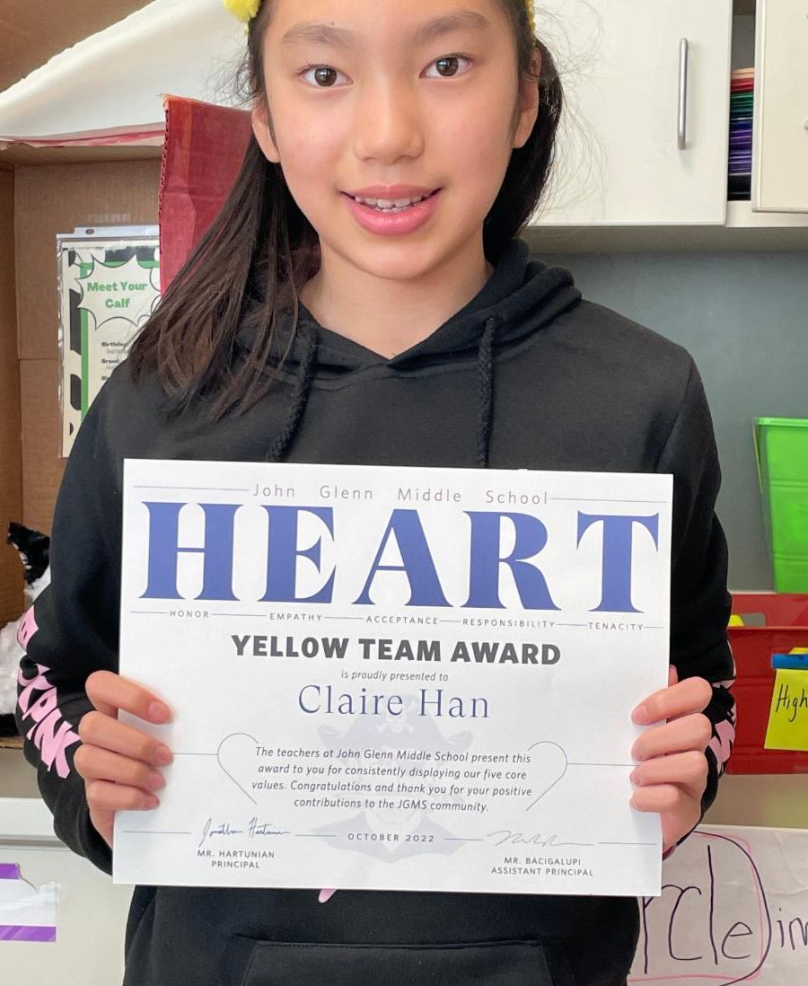 H.E.A.R.T is JGMS’s student motto. Students are expected to exhibit HONOR, EMPATHY, ACCEPTANCE, RESPONSIBILITY, and TENACITY. For the month of October, Claire Han was selected from Mrs. Eleftheriou’s class at JGMS. CONGRATULATIONS, Claire! We’re very proud of you!
