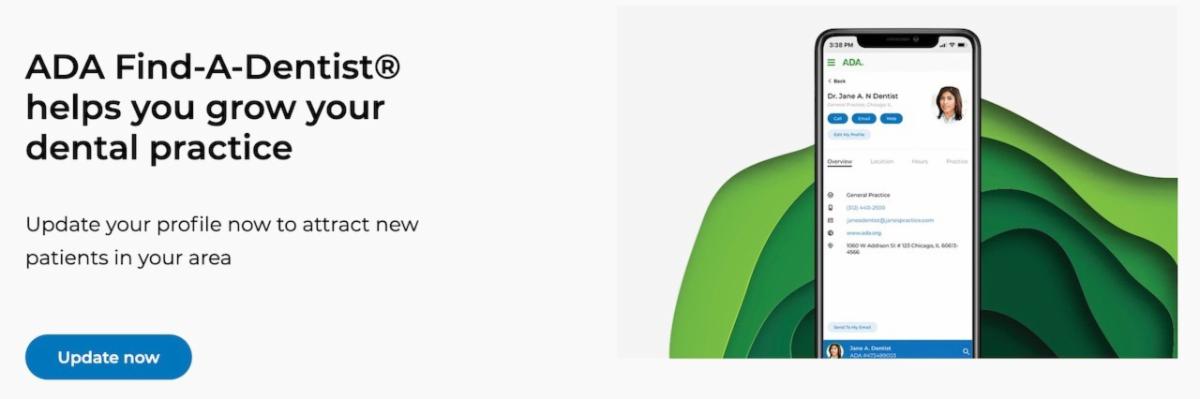 As a member, you have access to numerous benefits, including Find-A-Dentist. To make the most of this valuable FREE marketing platform, it's important to keep your profile current. The ADA has already established a basic profile for you on Find-A-Dentist, but you can log in at ada.org/findadentist to update it. (Make sure you scroll down to the area where it says "Are you a Dentist?") Updating takes just 5 minutes of your time.