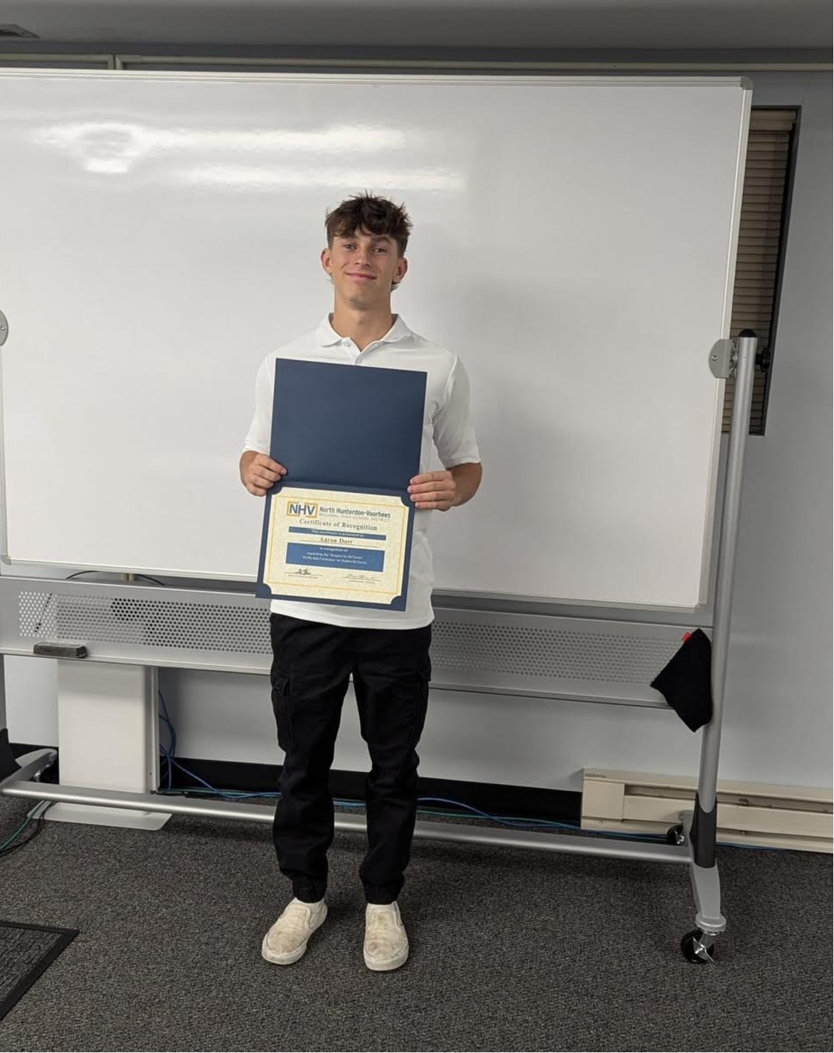 At the November 26th Board of Education meeting, North Hunterdon HS recognized Senior Aaron Dorr. Aaron organized and led the school-wide wiffleball fundraiser, Dingers for DeTorres, which raised over $750 for the "Sophia's Shining Light Foundation," which was set up to honor Sophia DeTorres.