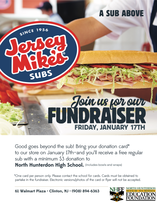 Receive a free regular sub with a minimum $3 donation to North Hunterdon High School.