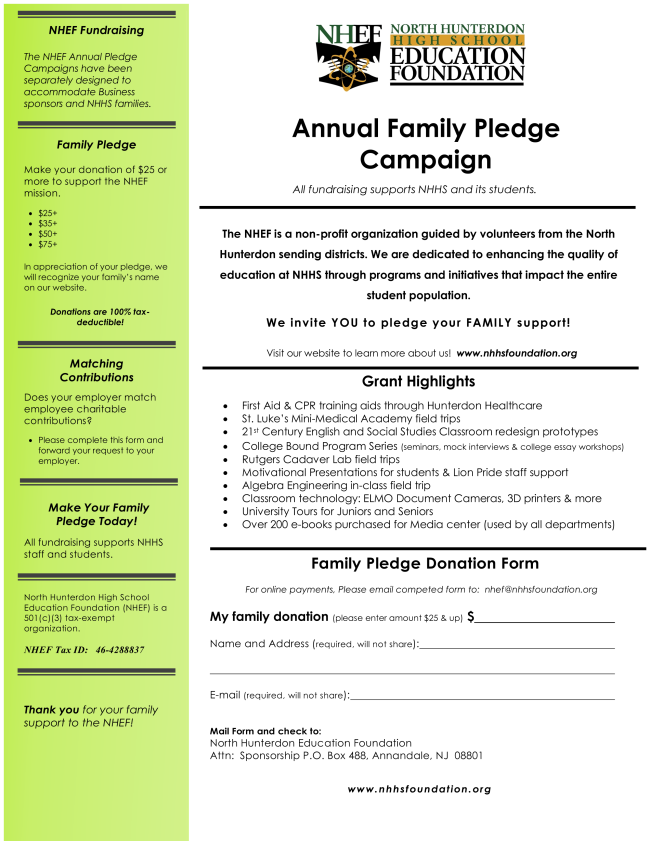 We are looking for new parent volunteers to join us in our efforts, especially in the following areas: Treasurer Support, Sponsorship Relationship, Communications, Grants, and Events. Please email a brief introduction and area of interest to: nhef@nhhsfoundation.org