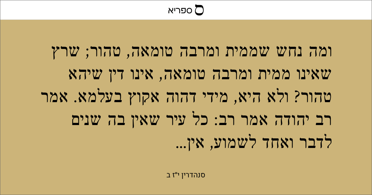 Sanhedrin 17b (Image credit Sefaria.org) | Sanhedrin 17b provides the requirements for a well-established town, and it does so by listing out the public services that are required, including a court, a charity fund, a synagogue, a bath-house, a public bathroom (oh, the lack of indoor plumbing), a doctor, a bloodletter, a scribe, a kosher butcher, and a school teacher. Rabbi Julie Bressler teaches that these express the achrayut, the responsibility, of leaders to provide for these sacred values in their town. She also points out that many of these requirements help a community maintain relationships across lines of difference. | |