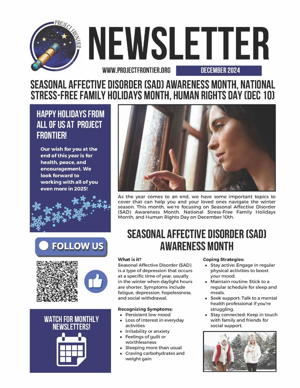 Please take a moment to read our December newsletter’s focus on Seasonal Affective Disorder, National Stress-Free Family Holidays, and Human Rights. It is always our hope that you will learn something that helps you and/or someone you know make the most of this season.