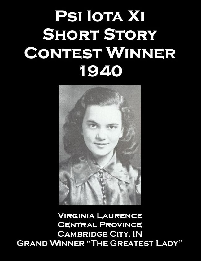 In the 1930s and 1940s, Psi Iota Xi held annual short story contests for high school students. The 1940 winner was Virginia Laurence of Cambridge City, IN for her short story "The Greatest Lady". You can read Virginia's short story, which was published in the 1940 Helicon, by clicking the link below.