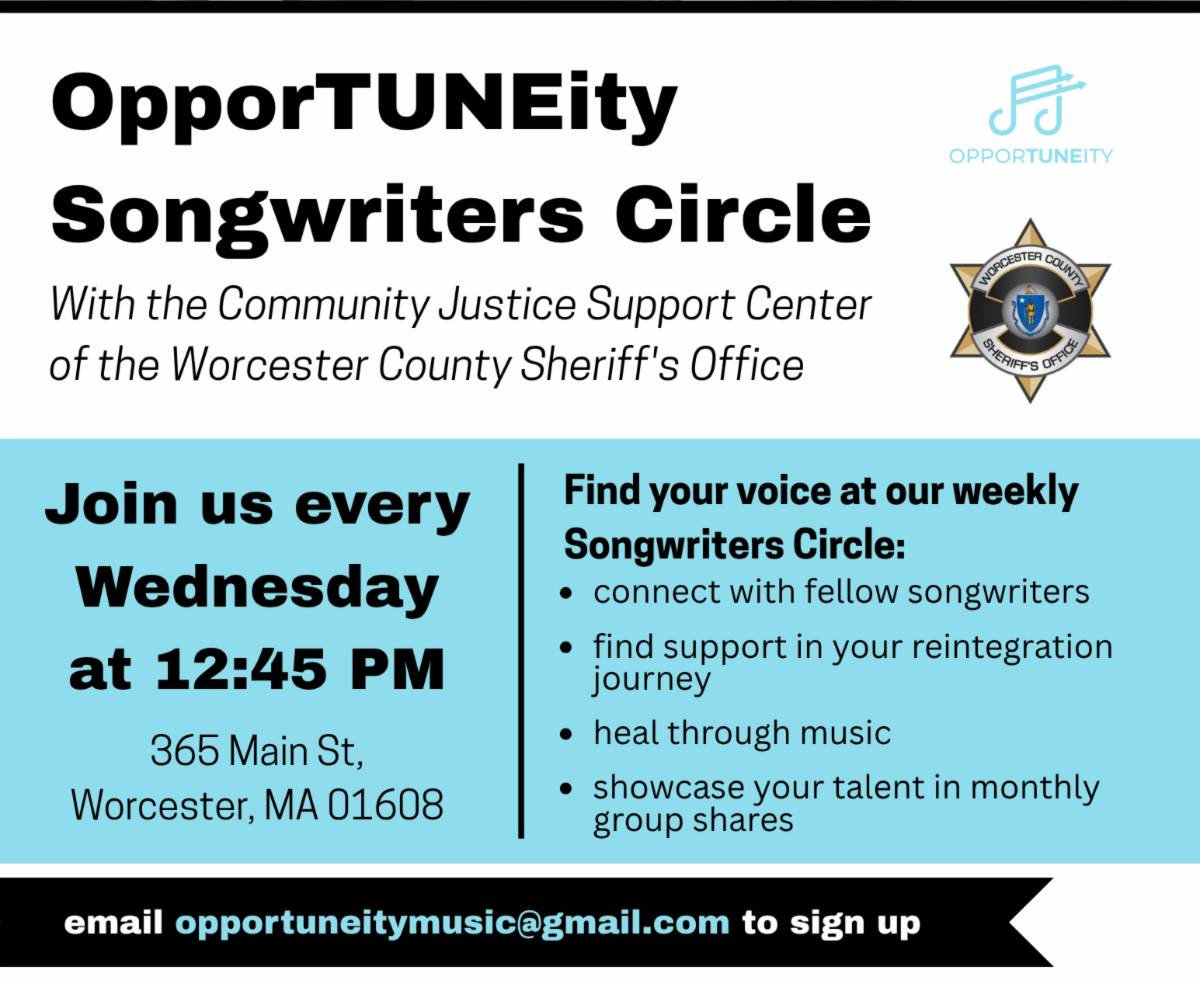 Listeners will have the opportunity to listen to original music by our students at the Worcester County House of Correction, written through our Beat Making and Production and Songwriting Fundamentals courses.