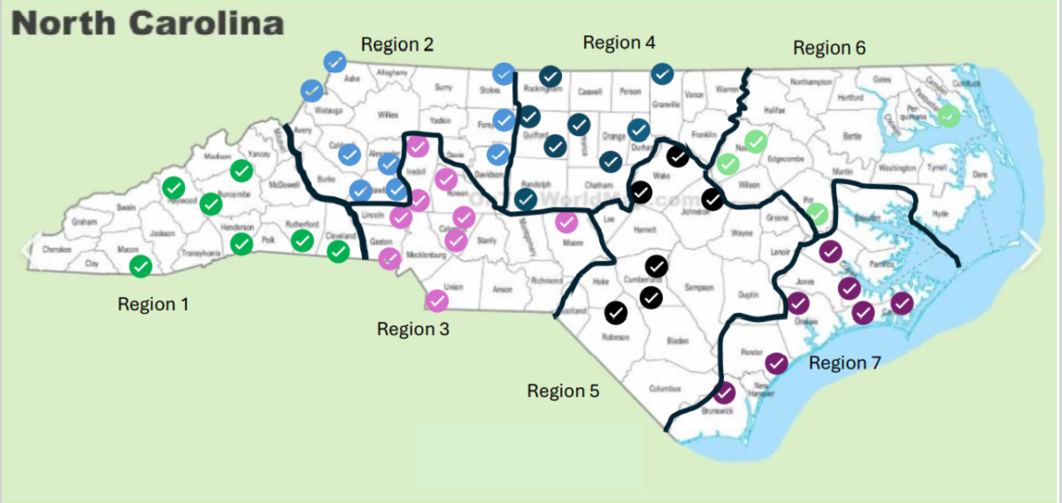 At the request of the Executive Committee in May, Michele Nix (Crystal Coast RW) and Stephanie Franks (Gaston County RWC) were tasked with reviewing the current map and regions of the NCFRW and to present an update to the map that would best serve all of our clubs. At the Fall Board Meeting, they presented the map below, increasing our Regions from 5 to 7. In January, at our Winter Board Meeting, we will vote on a change to our NCFRW Bylaws to allow for the addition of 2 Regions, creating 2 new Regional VPs. The Regions will follow the NFRW naming convention of using numbers.