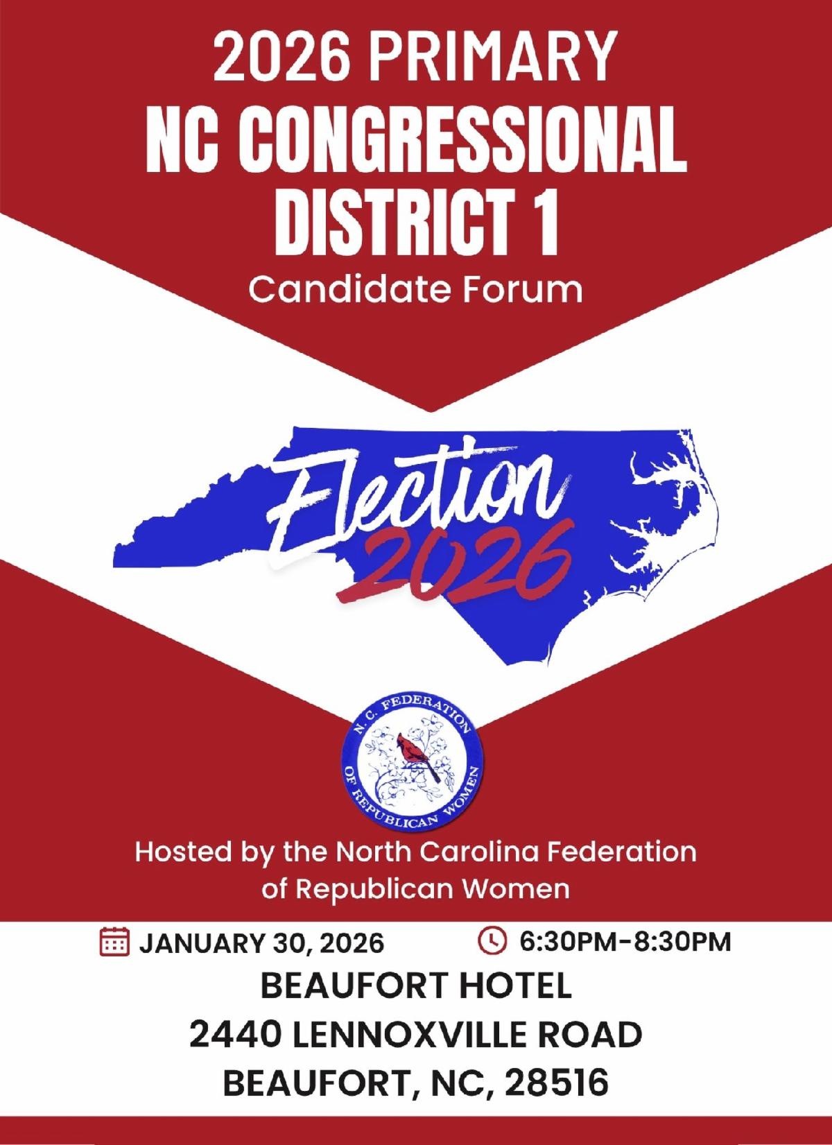 To kick off the Winter Board Meeting Weekend January 30-February 1, the NCFRW will host a Candidate Forum for the candidates for the newly drawn Congressional District 1 on Friday, January 30. This event will be open to the public and will begin at 6:30pm at the Beaufort Hotel.